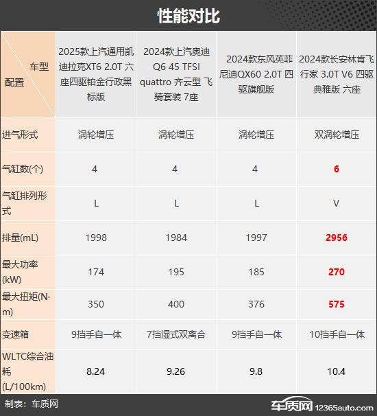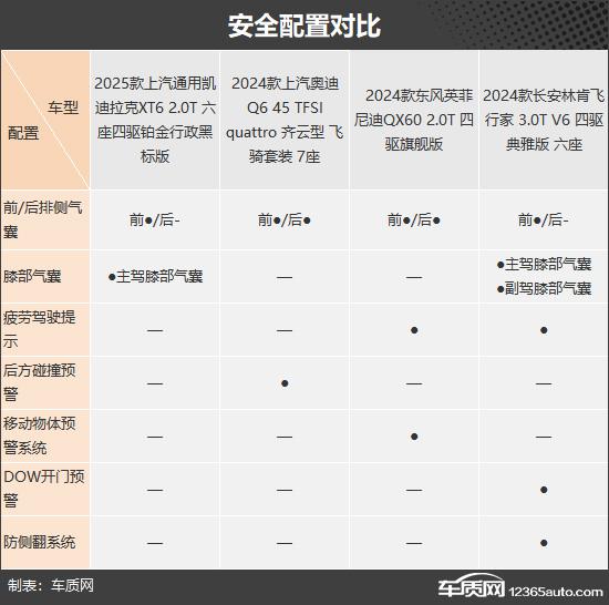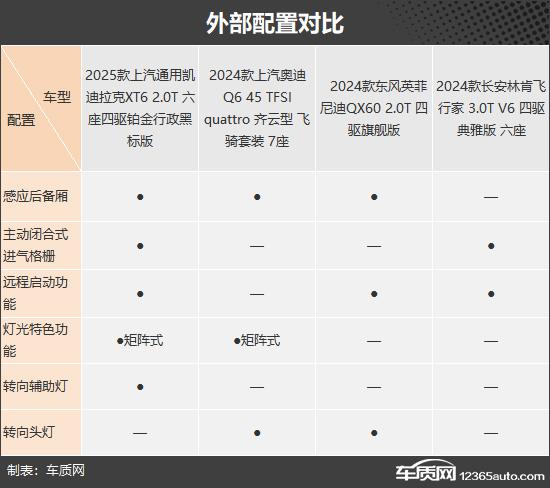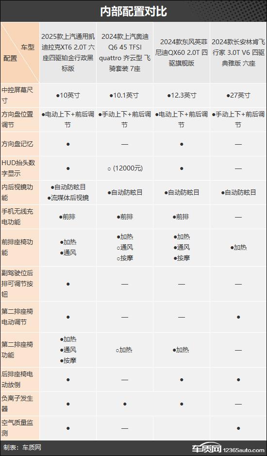 假如你最近正准备开始一款能兼顾多方面需求的豪华中大型。 SUV,这次推荐的四款车很值得考虑。这四款车型都来自国内一线合资车企,售后服务和产品质量都比较有保障。从上面的对比不难看出,凯迪拉克 XT6 整体性能更加均衡,不仅在四款车中具有最佳的燃油经济性,而且在动力性能、装备水平等方面也表现良好。奥迪 Q6 车身高度有优势,轴距仅次于林肯飞行家;与此同时,它还配备了它。 30 色彩斑斓的车内环境灯,能营造出更好的驾驶氛围。英菲尼迪 QX60 它的优点是独享 AR 现实生活中的导航,不仅具有较强的科技感,而且具有较好的使用体验。在四款车中,林肯飞行家的核心竞争优势在于轴距最长,并且具有强大而稳定的动力。 V6 发动机。