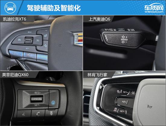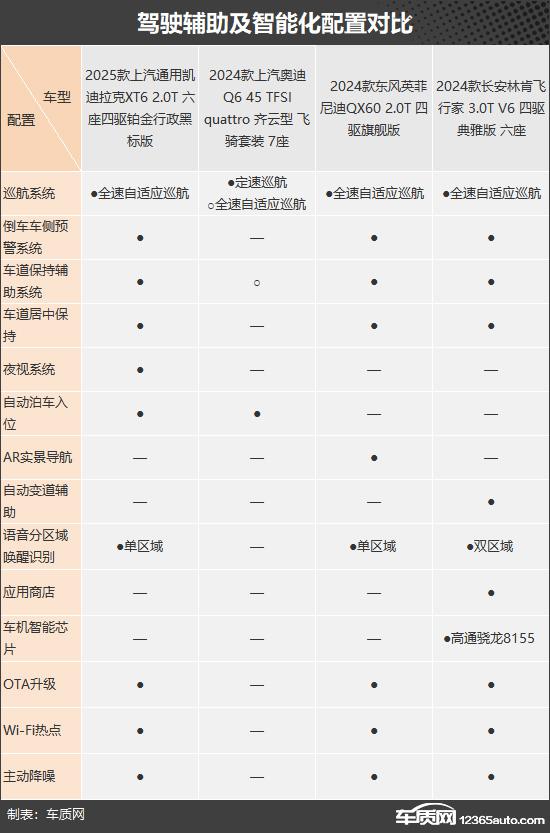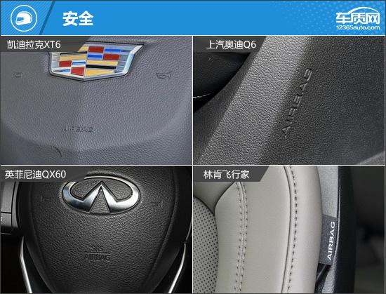 在驾驶辅助配置上,凯迪拉克 XT6 表现相对较好,独享夜视系统,并标配倒车车侧预警系统,全速自动巡航,车道保持和自动停车入位。英菲尼迪 QX60 同样值得称赞的表现,在四款车中独享。 AR 实景导航,能给驾驶员带来更好的用车体验。相比之下,奥迪 Q6 要稍逊一筹,是四款车中唯一没有配备倒车车侧预警系统,车道居中维修车型,而且只标配巡航。