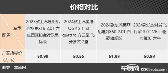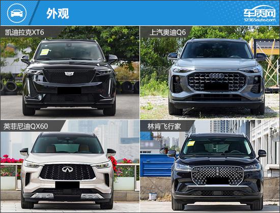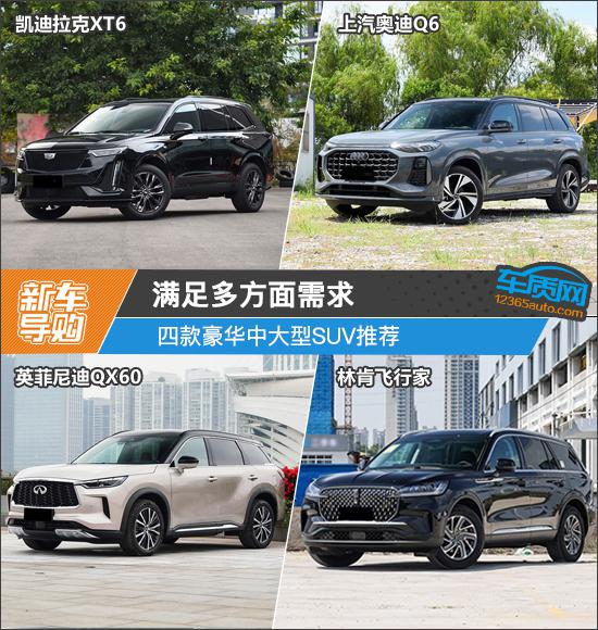 我们这次推荐的四款车分别是 2025 上汽通用凯迪拉克 XT6(以下简称:凯迪拉克 XT6)、2024 款上汽奥迪 Q6(以下简称:奥迪 Q6)、2024 东风英菲尼迪 QX60(以下简称:英菲尼迪 QX60)和 2024 长安林肯飞行家(以下简称:林肯飞行家)。四款车均定位豪华中大型车。 SUV,厂家指导价都在 51 万左右。(因为现在照片数量很少,所以有些车型的照片并不是相应的特定风格)