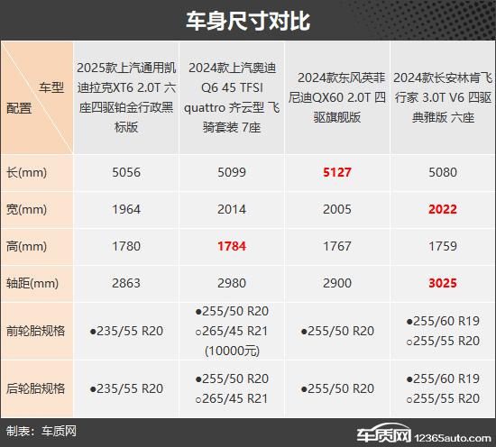 就车身长度而言,从数据来看,英国和菲尼迪 QX60 车身长度占优势,林肯飞行家的车身宽度和轴距优于其他三款车型,奥迪 Q6 在车身高度方面更有优势。