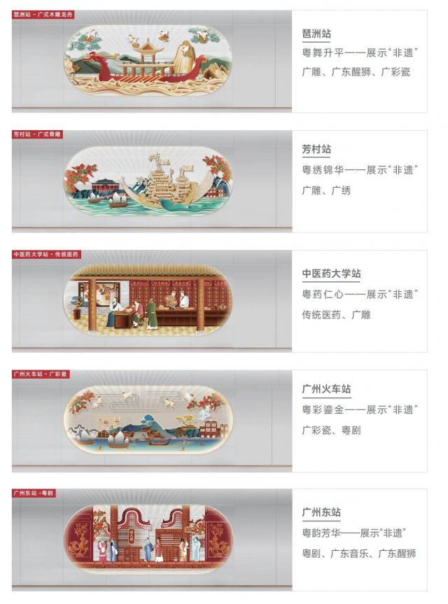 此外,在广州世界级、国家级、省市级“非物质遗产”内容中,中医药大学站“粤药仁心”主题、广州东站“粤韵芳华”主题分别选择粤剧、传统医药等非物质遗产项目进行整合设计,通过文化展示窗口和艺术展示墙进行展示。LED 多媒体展示屏等方式,带给市民沉浸式的文化体验和视觉盛宴。
