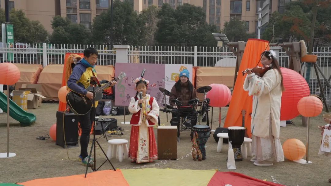 而且在户外场地上,一个小乐队正以吉他、架子鼓、小提琴为伴奏,“小主唱”轮流上台。最激动人心的是大班里的陈希孩子。她连续唱了几首《孤独的勇者》、《金色的童年》和《红色的太阳》,吸引了其他孩子的合唱。"过年是很特别的一天,我想给小朋友唱歌,今天我的愿望实现了,特别开心!”陈希说。