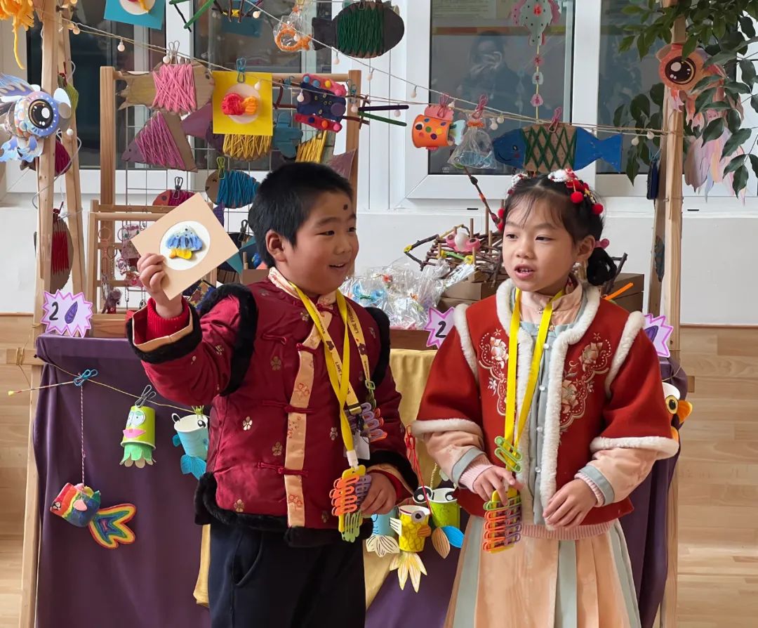 “我们摊位的簪花可以打五折!来‘买’吧!”大班的樊鹿嘉孩子卖自己班的手工簪花,时不时和小客户讨价还价。“看着簪花一点点‘卖’出去,很有成就感!”樊鹿嘉说。