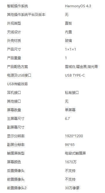 基本配置:6.75 英尺 LCD 大屏幕;6000mAh 22.5大容量电池W 快充;高通骁龙 680 Cpu,运行 HarmonyOS 4.2 系统。