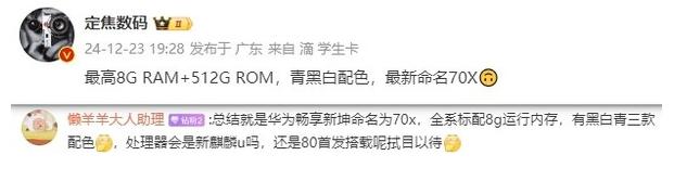 " 华为畅享 70X 最高搭载 8GB 512GB 内存组合;至少有三种颜色可供选择:青色、黑色和白色。