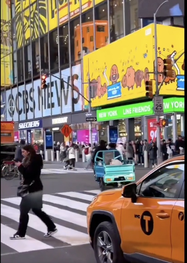 在纽约时代广场车流中,三蹦子穿梭,视频截图