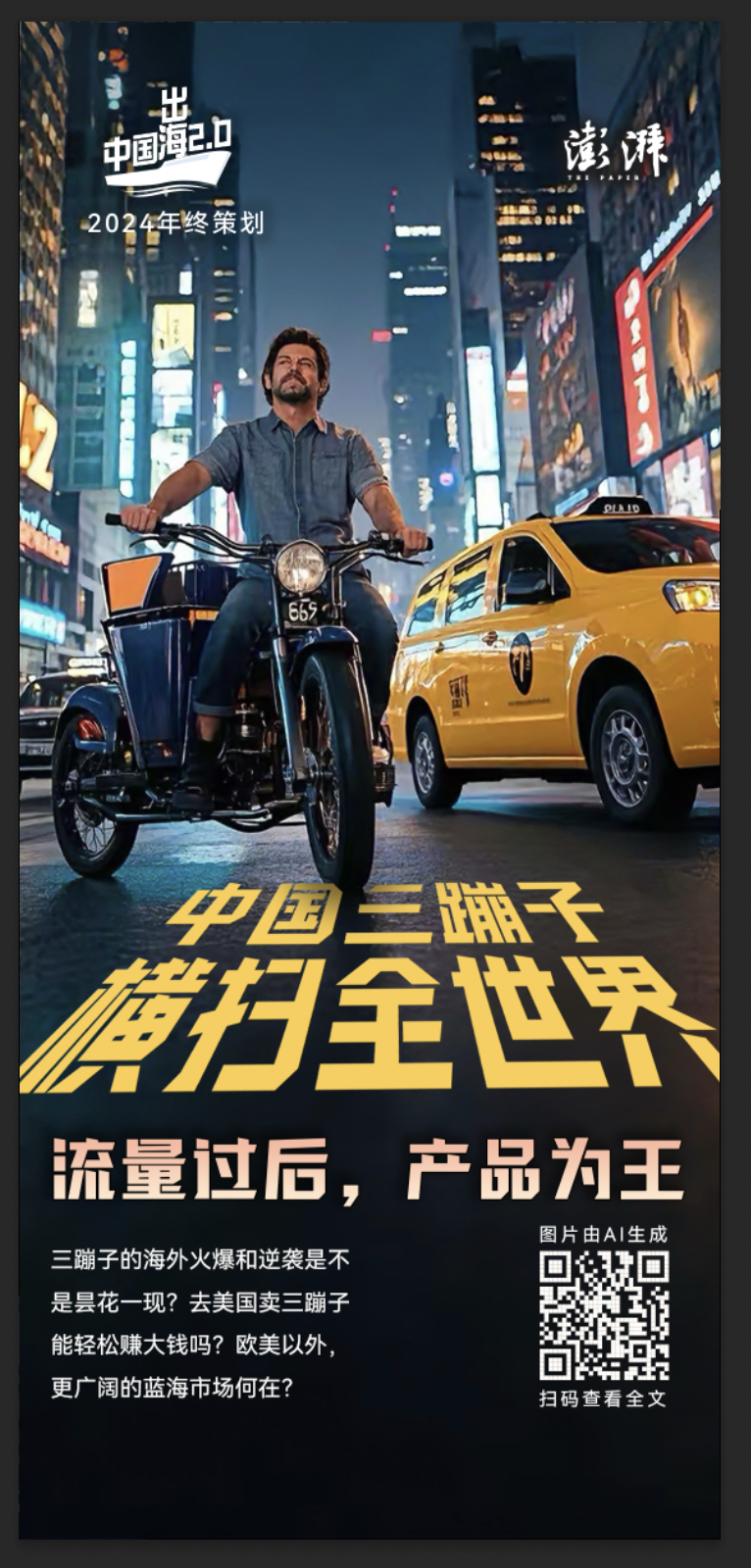 三蹦子着火了。整个2024年,有无数普通的三蹦子海外圈粉。随着标志性的“倒车请注意”这句话,一波奇幻的文化输出意外上演。纽约时代广场出现甩尾漂移,米兰车展大放异彩,排队试驾。国产电动三轮车在这些对比度很大的海外场景中名列前茅。它以其独特的外观吸引了人们的注意力,同时也因其高性价比和实用性而畅销。