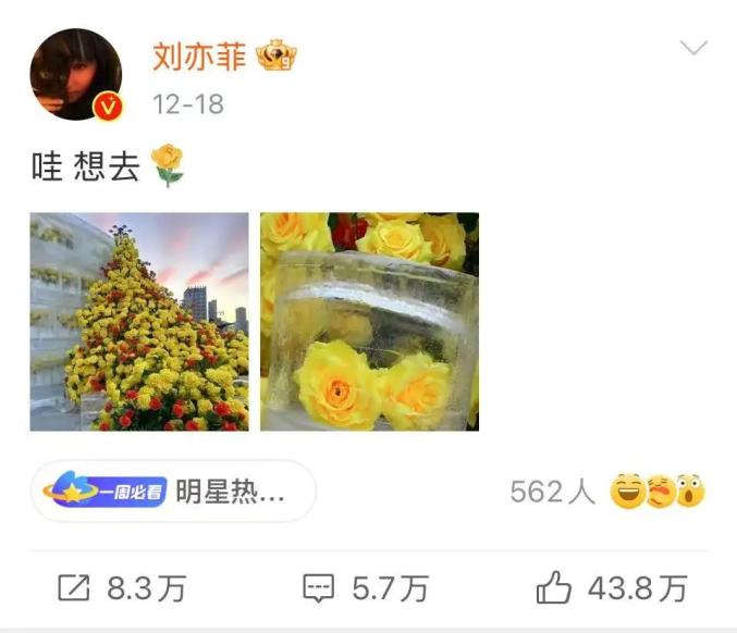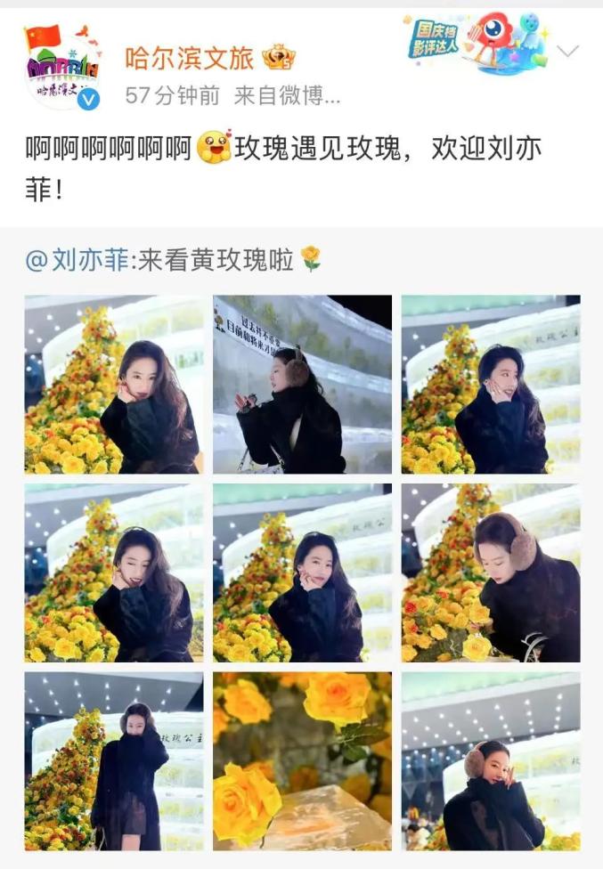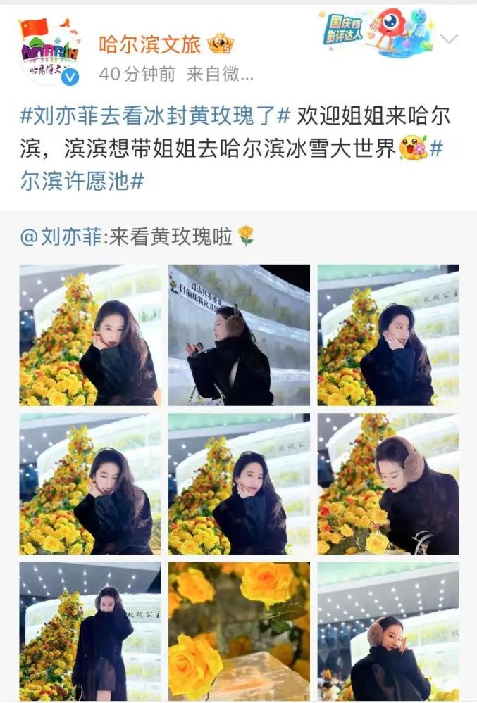 12月18日,哈尔滨文化旅游公布了一些黄玫瑰的照片,上面写着“冷冻玫瑰”,并引用了刘亦菲在《玫瑰的故事》中饰演的“黄亦玫”的经典叙事,宣布冬季正式亮相冷冻黄玫瑰。