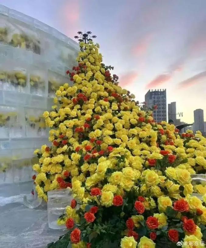 在此期间,哈尔滨冰冻黄玫瑰美上热搜!