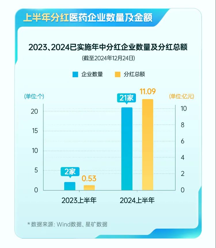 截至2024年12月24日,科技创新板已有21家生物医药企业实施年中分红,分红总额为11.09亿元。此外,许多披露2024年年中分红计划的公司正在等待计划的实施。