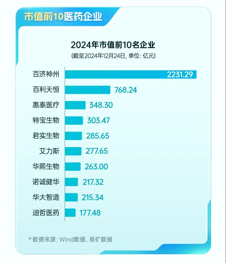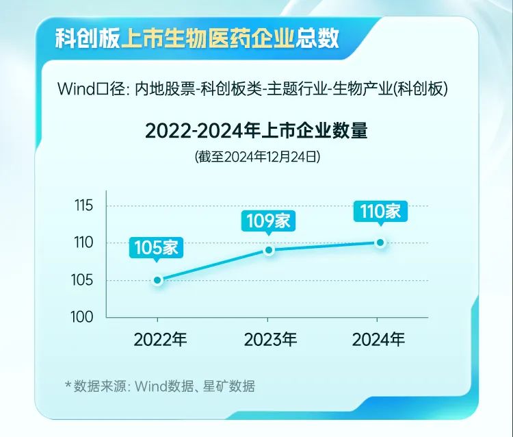 2024年,登陆科技创新板的生物医药企业数量达到110家,比2023年增加一家,总市值超过1.1万亿元,创新药企百济神州市值领先。