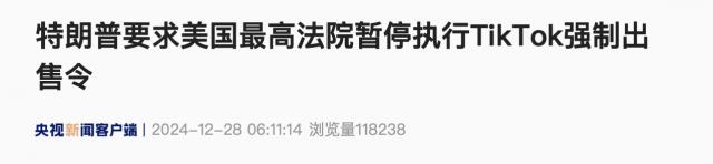 当地时间是央视记者 12 月 27 日获知,美国当选总统特朗普向美国最高法院提出要求,要求暂停执行。 TikTok 强制性销售令。特朗普说,他希望法院在明年。 1 月 20 日本正式任职后,给他时间通过政治手段解决这一争议。