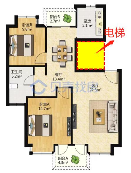 普通户型,厨房应位于电梯的那个位置,与客厅相连。