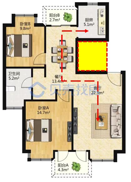 假如是从南面的卧室 B 去洗手间,要经过客厅再走近 4 只有米长的过道才能到达