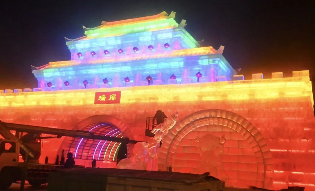 冰雕景观《盛世中华》以宏伟的冰雪景观大门为主体设计,嵌入显眼的“瑞扉”门牌,两侧配有“天工”“摇摆”冰雕场景。取“瑞扉”之意,寓意吉祥之门;“天工”以自然形成的技巧,象征着华夏的卓越和卓越的技艺水平;“摇摆”来源于庄子的自由之旅,意味着中国在盛世的快速发展和繁荣。
