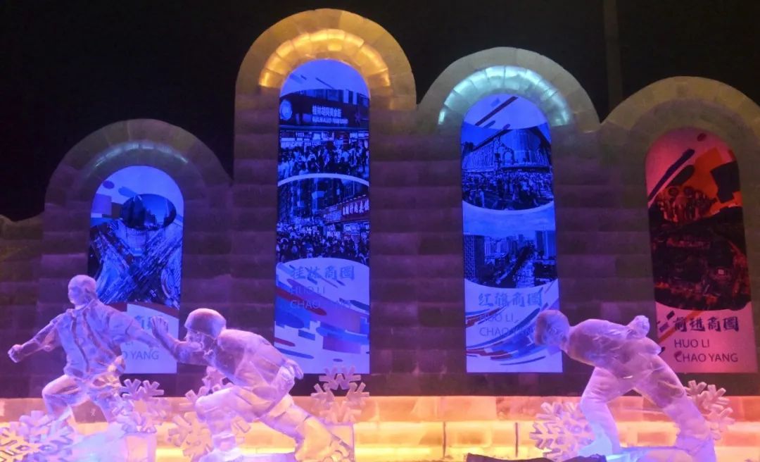 冰雕景观《生机勃勃的朝阳》以滚滚的波浪和灵动的翅膀为设计风格。高耸的四个拱门四大商业区的美图,充分展现了朝阳区“重庆、桂林、红旗、前进”商业区的风采。景观前增加了青少年冰雪运动场景,充分体现了城市活力中心的节奏。