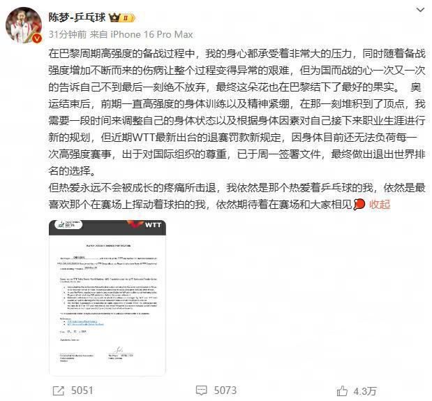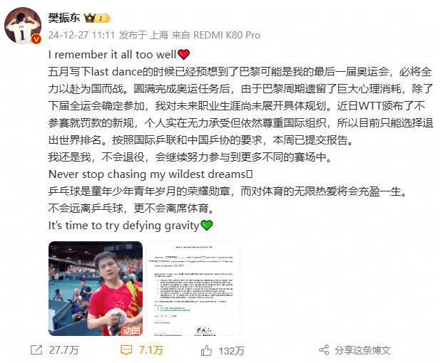随着元旦的临近,樊振东和陈梦先后在微博上发布消息,决定退出全球排名。作为巴黎奥运会乒乓球男女单打冠军,同时退出全球排名,真的引起了很大的轰动。