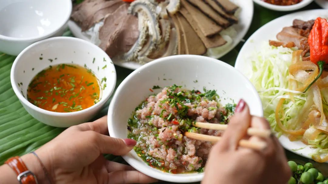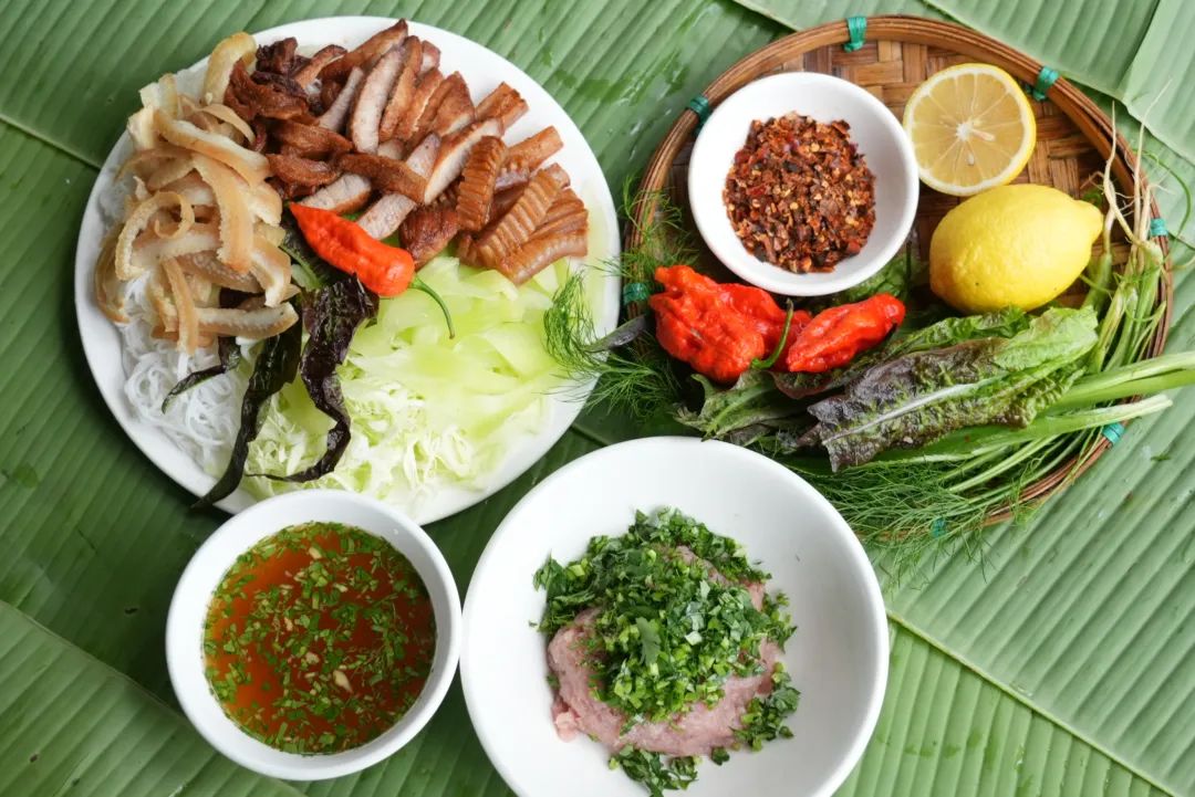 撒达鲁以鲜精猪肉和少量猪肝为主要原料,配菜包括藜蒿、火烤猪皮、卷心菜、竹笋、青木瓜等。吃的时候,鲜嫩的肉香、新鲜的蔬菜和果汁的酸味交织在一起,口感层次丰富多样,让人胃口大开。