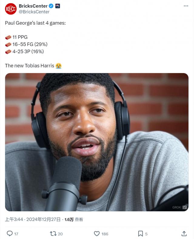 媒体 BricksCenter 晒出乔治的过去 4 场数据:场均 11 分数;投球合计 55 中 16,准确率 29%;三分合计 25 中 4,准确率 16%。媒体嘲讽乔治:“新版托拜亚斯 - 哈里斯。" 76 教练纳斯说:“我觉得乔治投球选得很好,虽然没有进球,但我也很满意。”