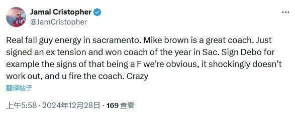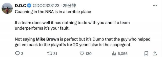 " NBA 教练们的情况非常糟糕,如果一支球队表现出色,那就和你做什么;如果一支球队表现不佳,那就是你的错。 也不是迈克 - 布朗是完美的,但是这个帮助球队的时间很近。 20 年度重返季后赛的人却成了替罪羊,这太愚蠢了。"