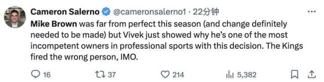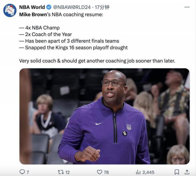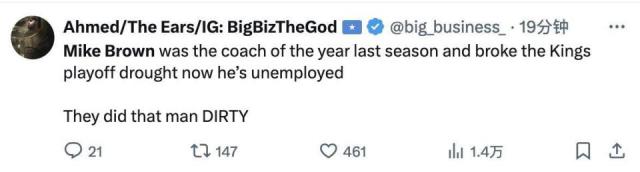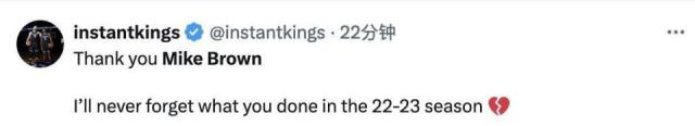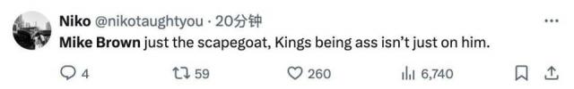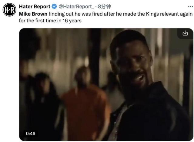 "迈克 - 在上个赛季,布朗是年度最佳教练,他打破了国王的季后赛荒,但是现在他被解雇了,国王做的事很卑鄙!