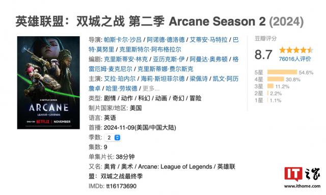 第二季动画剧《英雄联盟:双城对决》 11 月 9 日开播,共 9 集,已于 11 月 23 每天正式完成。截至 IT 世家发文,目前这部动画剧的豆瓣评分 8.7。其中: