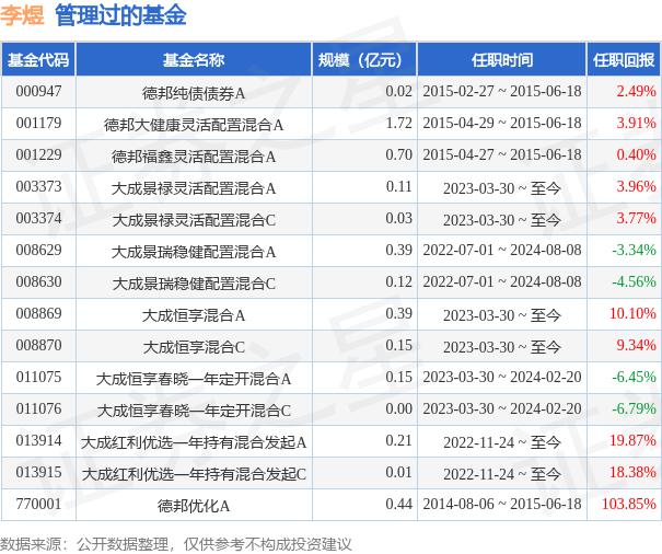 李煜先生:中国国藉,南京理工大学工学博士。曾在国鑫证券有限公司、德邦基金管理有限公司、博时基金管理有限公司、南方基金管理有限公司工作,曾担任行业研究员、基金经理、研究部主任、投资经理。2014 年 8 月至 2015 年 6 每月担任德邦优化混合基金主管主管部门。 ;2015 年 2 月至 2015 年 6 每月担任德邦新动力混合基金主管部门。 ;2015 年 4 月至 2015 年 6 每月担任德邦福鑫混合、德邦大健康混合基金主管。2022 年 3 现任股市投资部基金经理,每月加入大成基金管理有限公司。具有基金从业资格。2022 年 7 月 1 日至 2024 年 8 月 8 日本担任大德景瑞配备混合型证券投资基金的基金经理。2022 年 11 月 24 作为一年持有期混合型发起型证券基金基金经理,日起担任大德收益优选。2023 年 3 月 30 日起担任大德恒享春晓一年定期开放混合型证券投资基金经理。目前,大成恒享混合型证券投资基金主管。2023 年 3 月 30 日起担任大德景禄混合型证券投资基金经理,灵活配置。