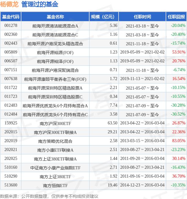 杨德龙先生:清华大学五道口金融学院全球金融博士 ( GFD ) ; 北京大学光华管理学院金融硕士学位 ; 本科毕业于清华大学机械工程系,获得工程学士学位,具有基金从业资格。2016年,曾任南方基金管理有限公司研究部研究员、基金经理 年 3 现任前海开源基金管理有限公司首席经济学家、股权投资总部基金经理,每月加入前海开源基金管理有限公司。2019 年 5 月 9 日至 2021 年 2 月 2 日,任前海开源裕源混合基金中基金 ( FOF ) 基金主管、2019 年 5 月 9 日至 2021 年 2 月 2 日,任前海开源裕泽定期开放混合基金中基金 ( FOF ) 基金主管、2019 年 11 月 13 日至 2021 年 2 月 2 日本,任前海开源康颐平衡养老目标三年持有期混合型发起型基金中基金 ( FOF ) 基金主管、2021 年 3 月 18 日至今,任前海开源清洁能源主题精选混合型证券投资基金经理灵活配置,2021年 年 5 月 7 日至今,任前海开源深圳特区精选股票型证券投资基金主管。2021 年 11 月 18 日本担任前海开源沪港深龙头精选混合型证券投资基金主管。2021 年 11 月 18 日本担任前海开源沪港深龙头精选混合型证券投资基金主管。2021年 年 11 月 18 日本担任前海开源沪港深聚瑞混合型证券投资基金主管。