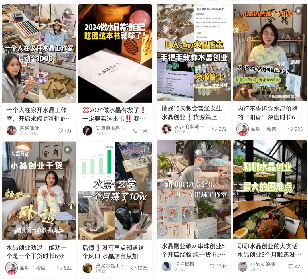 一直以来,袁菲的水晶生意虽小但还算稳定,退货率和差评率都不高。不过,从今年年初开始,一大批新手涌入这一行业,试图分一杯羹。用她的话来说,越来越多不懂水晶的人进入市场,甚至成为大学生从事副业、在家创业的热门跑道。在社交媒体上,这种现象尤为明显。卖水晶的笔记和教程如雨后春笋般涌现,远远超过了买家秀的总数,也直观地反映了卖家市场的严重饱和。