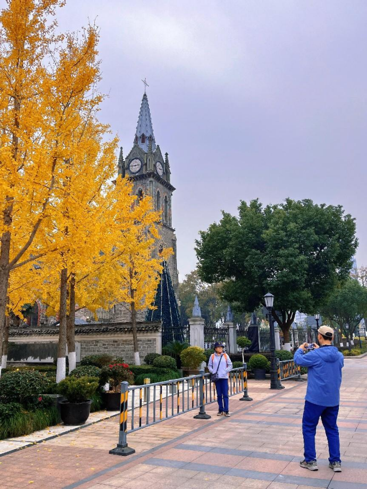 在天主教堂旁边,街上铺着金色的银杏叶,与教堂庄严的哥特式建筑相得益彰。它不仅是一个充满宗教和历史氛围的地标,也是摄影师心目中的绝佳位置。