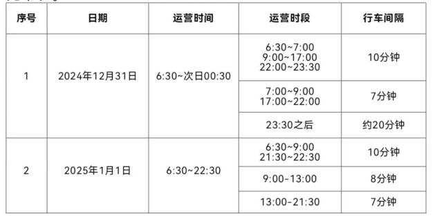 2024年12月31日运营时间增加2小时,调整为6小时。:30~次日00:2025年1月1日运营时间为60日。:30~22:30,最小行车间隔调整到7分钟。节日期间,旅游景点、枢纽站、主要商业区附近的地铁站客流较大。乘客应合理规划出行时间,并在乘坐公交车时按照工作人员的指导有序排队。(来源:洛阳。com)
