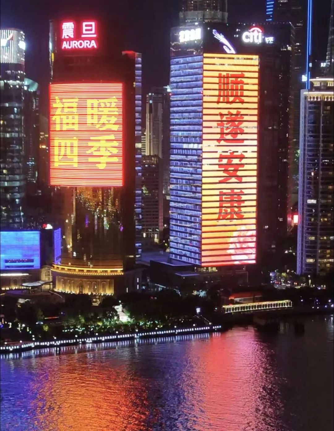 黄浦江沿岸的主要媒体,如震旦大厦、花旗银行大厦、上海中心大厦、浦东美术馆、港务大厦、白玉兰广场、国际港务大厦、国际客运中心建筑等。,正面播放元旦主题宣传视频。