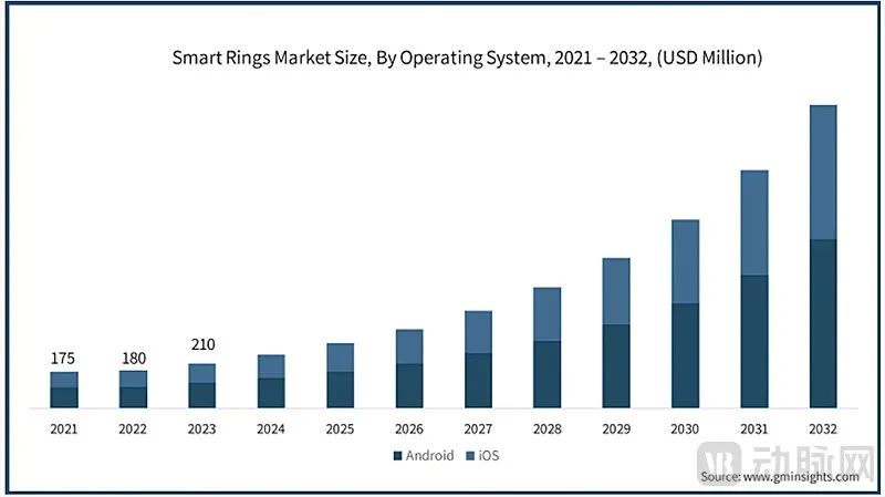 2024年Oura的快速发展只是智能戒指在大健康领域突破的一个缩影。Globalalalobal Market 根据Insights的数据报告,2023年智能戒指市场规模将达到2.1亿美元,预计2024~2032年市场复合增长率将达到24.1%,到2032年市场规模将达到10亿美元。