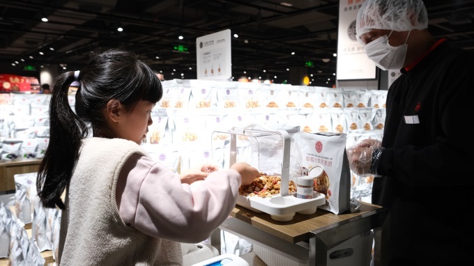 除了当地的生鲜产品,晚餐还有闽淡茶口干、闽侯桐口干、福州线面等。饮料包括青口青红酒、鼓山福建老酒等。年货方面,礼饼、芋泥、八宝饭、年糕等。福州人在节假日经常吃的。品牌方面,鼎鼎肉松、日立肉松、大世界橄榄果脯、赛园果脯等“福州老品牌”也进入“福州特色商品馆”。假如想现场来一口福州风味,热腾腾的鱼丸,肉燕,拌面,锅边等等都可以现做现买现吃。