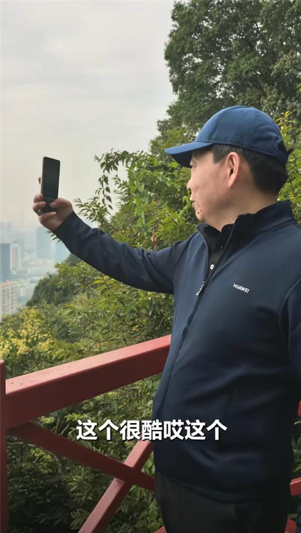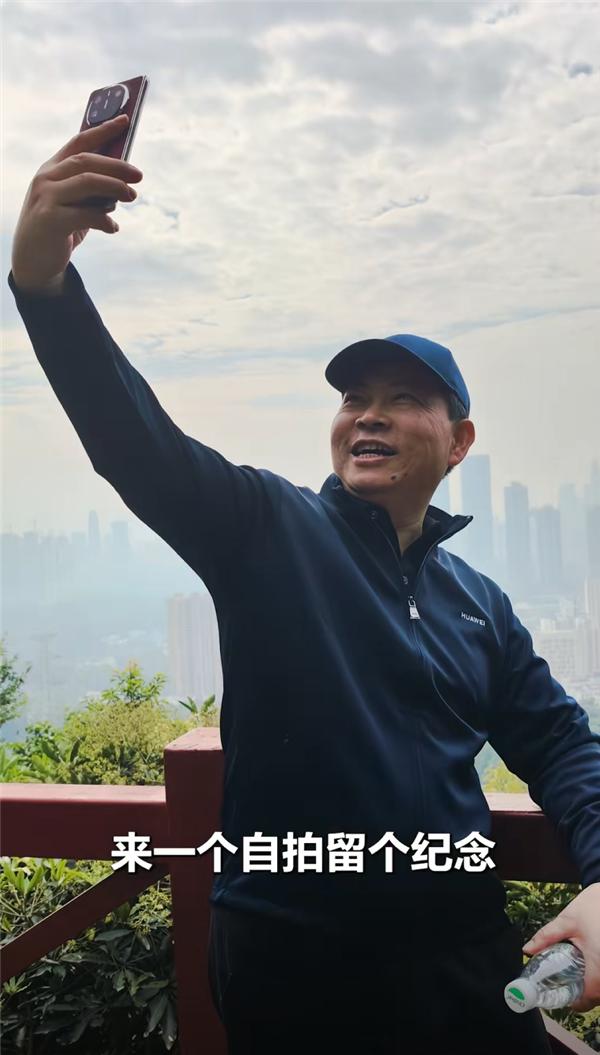 余承东登上顶峰后,手持华为 Mate X6 折叠式旗舰拍摄城市美景,并自拍纪念。