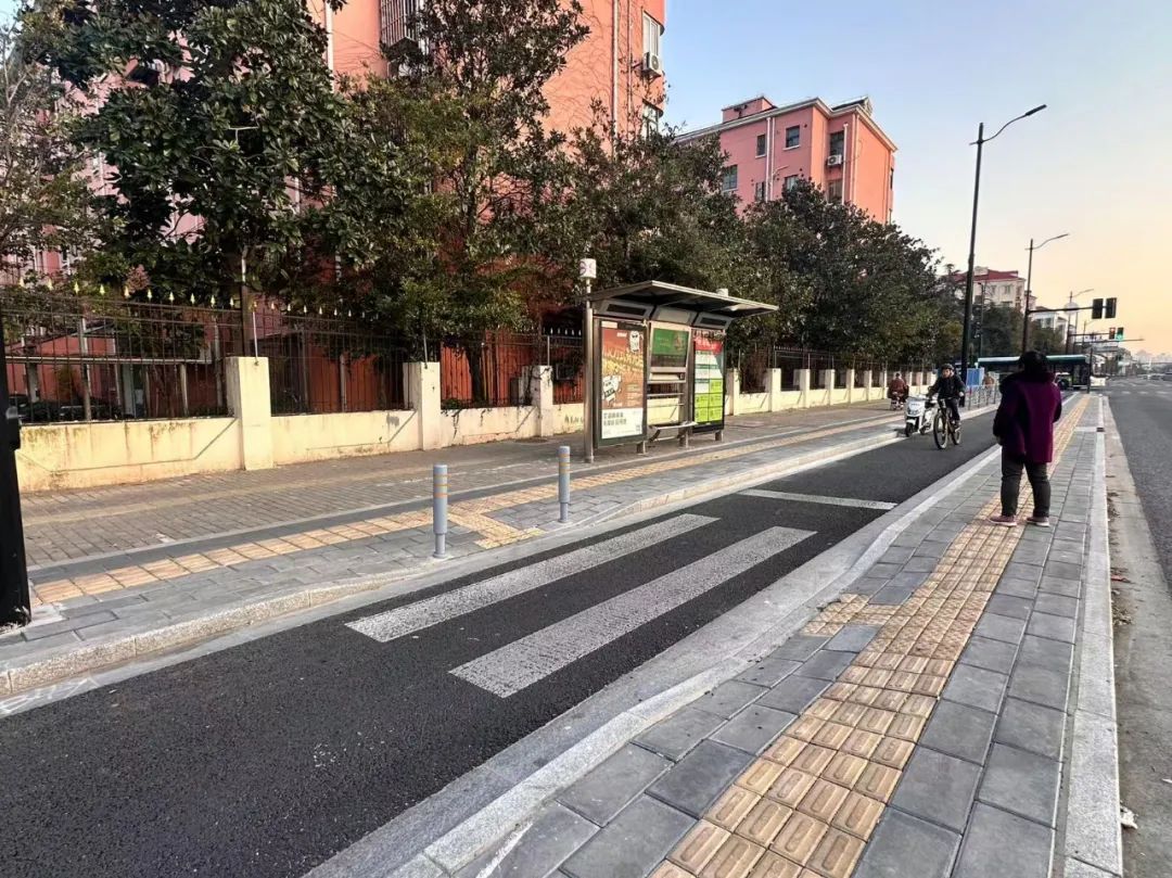 改造通过设置边缘石坡道来清除侧石高差,解决了非机动车道与站台高差的连接问题。此外,人行道标志标志标志标志标志标志标志标志标志标志标志穿越路径,为行人通过人行道穿越非机动车道进入公交站台提供了便利,提高了市民的乘车安全性。