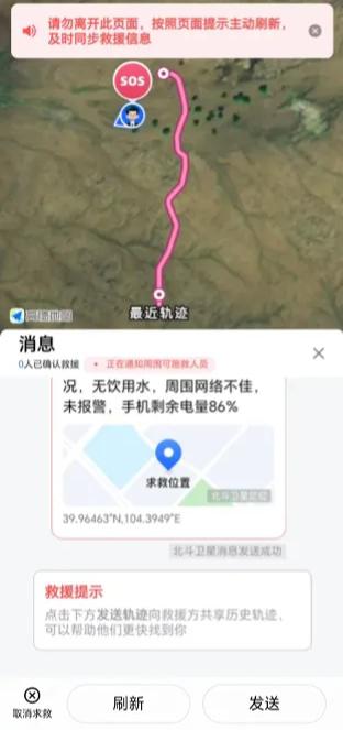 在无路网区域和无网络的情况下发起求助。本次升级增加了北斗卫星(北斗短信)的新卫星通信模式。使用中国移动运营商的用户可以通过北斗短信业务使用卫星求助功能。