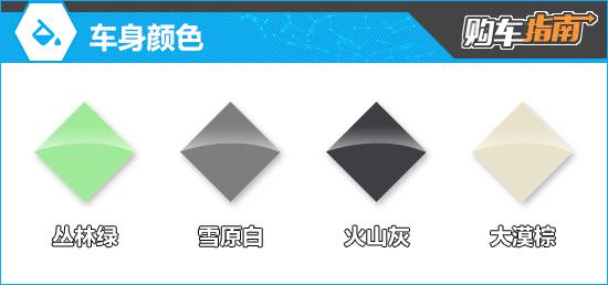 在车身颜色方面,新车提供了四种车色:雪原白、丛林绿、火山灰、沙漠棕。其中,丛林绿车身的颜色非常值得推荐,与整车越野套件相匹配非常有活力。