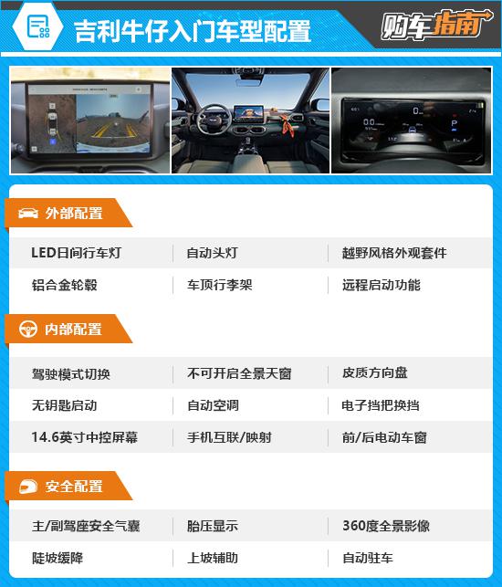 吉利牛仔入门级车型为潮玩版,售价为 9.39 一万元(限时专属价格为 8.99 万元)。从配置表可以看出,LED 日间行车灯、自动大灯、铝合金车轮、14.6 英寸中控屏,主 / 副驾驶座安全气囊及 360 全景视频等都有配置,整体配置还是很丰富的,不过入门版并不是这次推广的主要车型,因为还有性价比更高的选择。