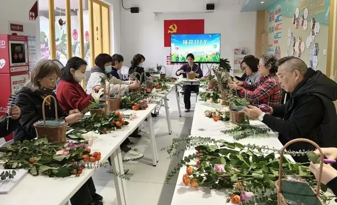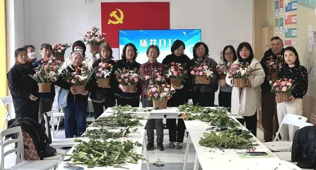 活动后半段,新泾镇街区党支部邀请了花艺老师庄老师,带大家进行插花DIY。“对于一些有刺的花,比如玫瑰,需要用小剪刀把刺剪掉;对于一些容易枯萎的花卉,可以在水中加入适量的防腐剂来延长花期……”在老师的耐心指导下,参与者逐渐掌握了插花的基本技巧。漂亮的波斯菊,可爱的康乃馨,清新的雏菊...我看到每个人都精心挑选花朵,巧妙地将颜色和形状结合起来,时不时地发挥自己的想象力,发挥自己的创造力,改变插花的布局,让每一件作品都独树一帜。