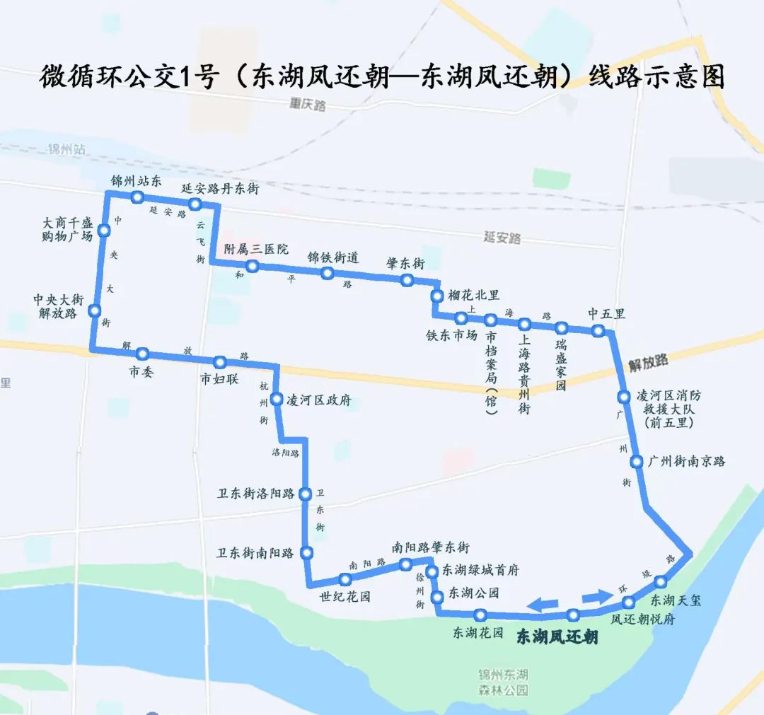 微循环1号线,起点是东湖凤还朝公交首末站,经过堤坝路、徐州街、南阳路等重要道路。设立附属三家医院 、锦州站东,大商千盛购物广场,市委 、28对公交车站,如东湖公园和铁东市场。