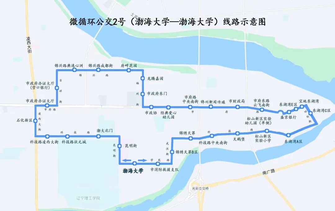 微循环公交2号线起点为渤海大学东门学苑路公交首末站。经过武汉街、科技路等重要道路,设立了市消防救援支队和锦绣天第B区。 、30对公交车站,如科技路、中央南街、天鹅堡、松山新区实验小学等。
