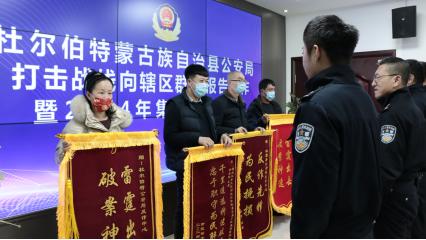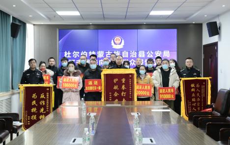 2024年,大庆市公安局杜蒙县局以建设安全杜尔伯特为核心,深入推进“百日行动”、“冬季行动”等专项整治,严厉打击侵害群众利益的各类电信诈骗、盗窃、抢劫等违法犯罪活动,以侵财犯罪为重点,回应人民群众对社会安全新期待的发力点和突破口。共破获电信诈骗案51起,抓获犯罪嫌疑人122人,挽损77.27万元;破获各类侵权案件118起,追赃挽损200多万元。回到赃物现场,警方将破案追回的电动摩托车返还给受害者,受害者在收回被盗财物时向办案民警赠送横幅表示感谢。