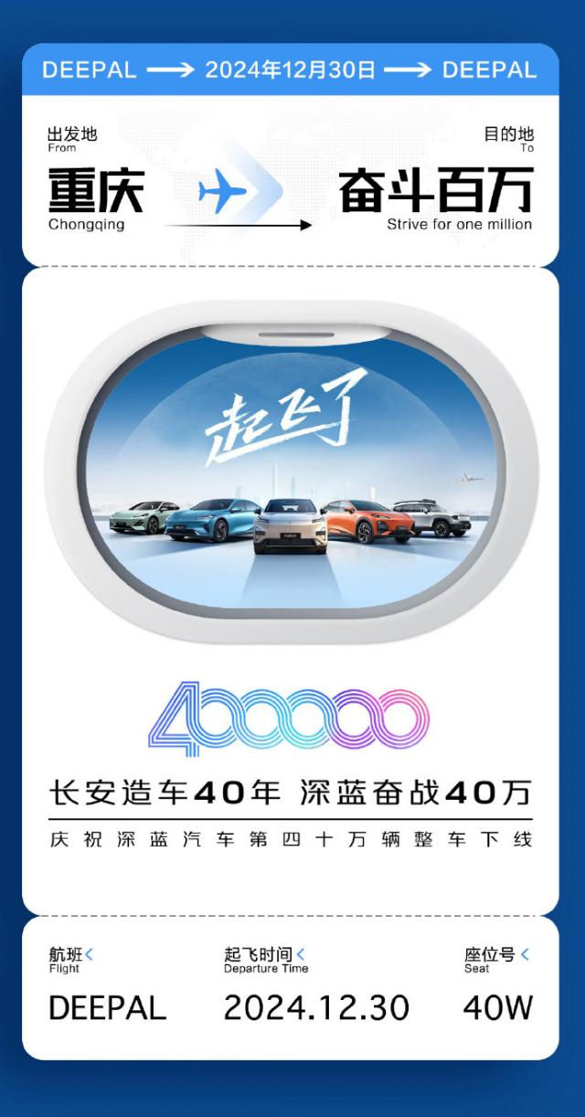 IT 世家 12 月 28 据日报报道,长安旗下深蓝汽车今日以“机票”的形式发布海报,庆祝深蓝汽车第40万辆全车下线,起飞时间为 2024 年 12 月 30 日本,始发地是重庆,目的地是“奋斗百万”。