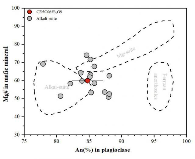 根据矿物化学成分分析,这种岩屑属于罕见的月球碱性岩 ( Highlands Alkali Suite, HAS ) ,这是嫦娥五号月壤第一次发现这种岩层。