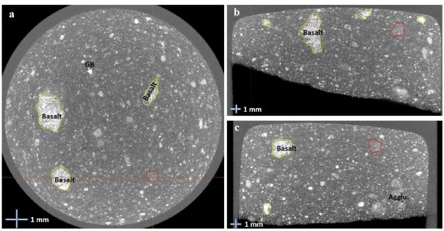 图 1 CE5 月壤 JFM00305CE5C0600 的显微 CT 分析数据。CT 测量结果的横截面显示了疑似非月海岩屑(红圈区)、月海玄武岩及玻璃珠等成分