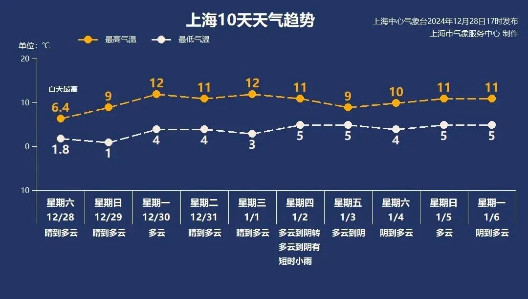 对于上海来说,下周降雨依然稀缺,周初阳光明媚,最高气温在11~12℃,中午前后体验相对温暖。元旦假期阳光明媚,云多云,3~12℃,东北风3~4级。假期过后,弱冷空气扩散,云系数增加,2日出现弱降雨,气温短暂下降。