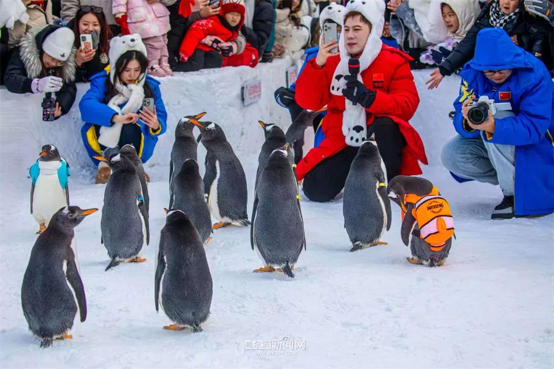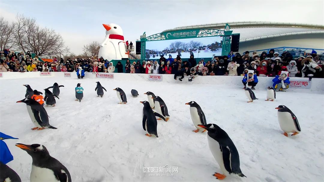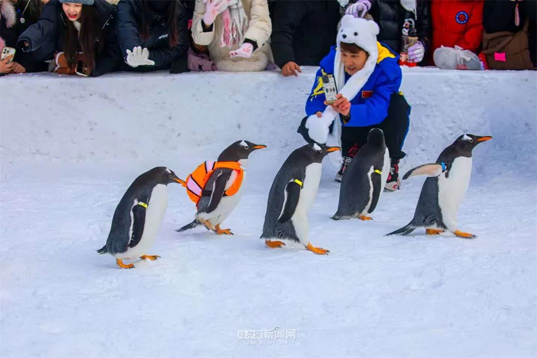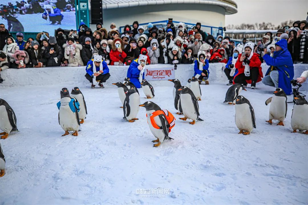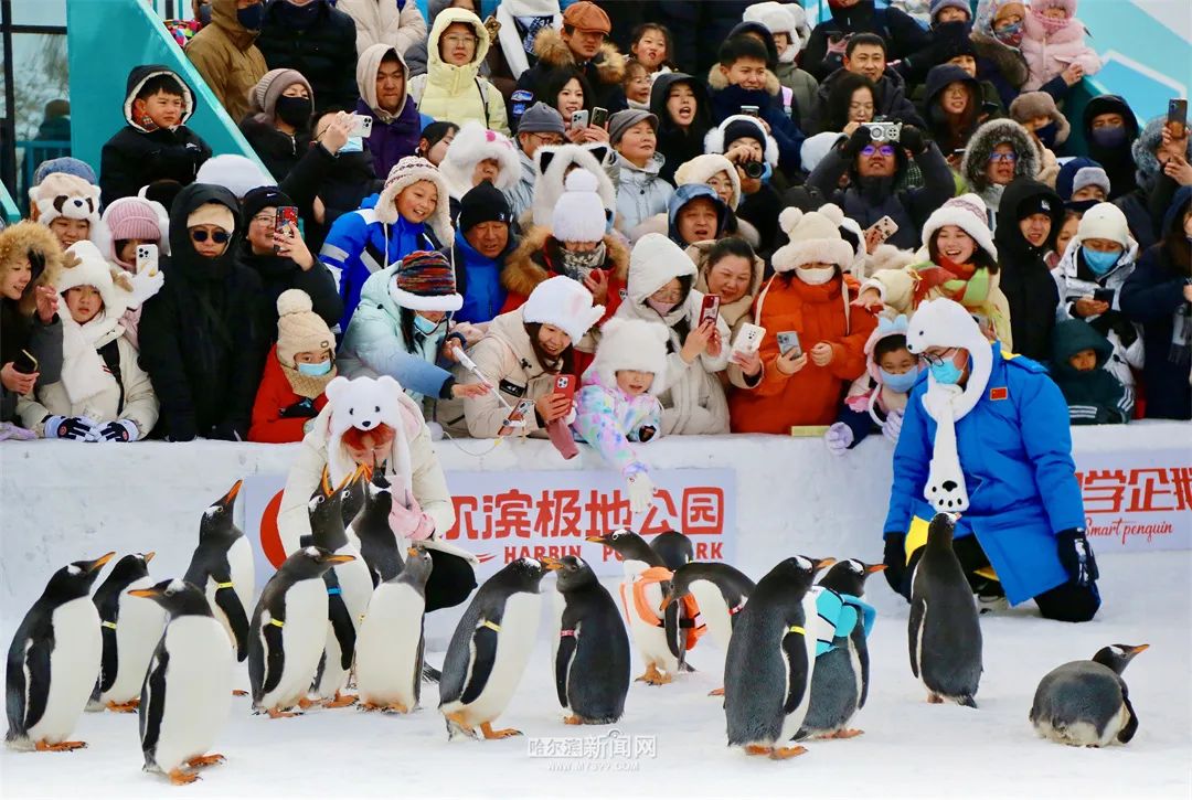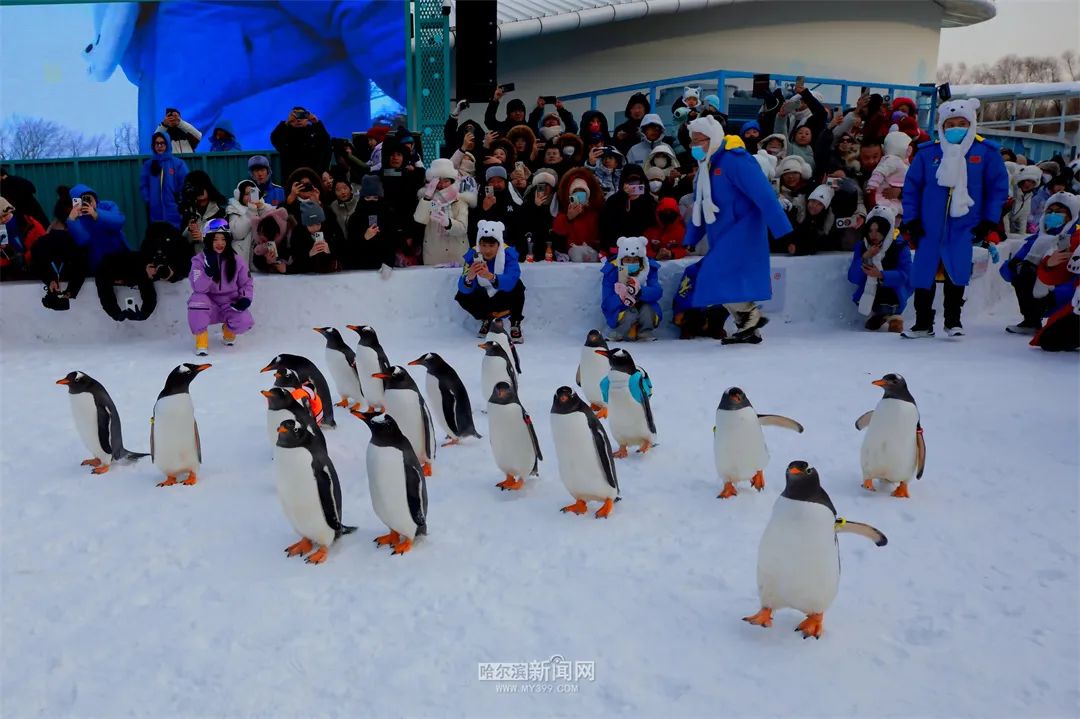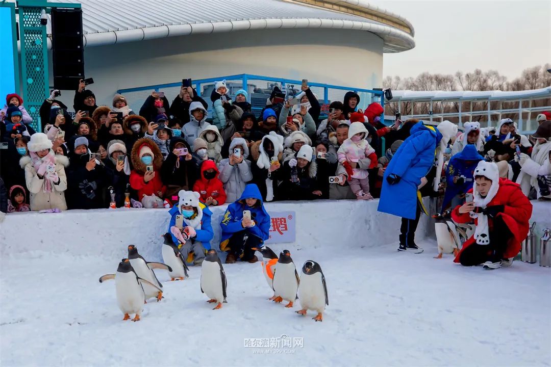 游客大喊“看不够!”哈尔滨极地公园第一场“淘学企鹅”冰雪巡游开启。