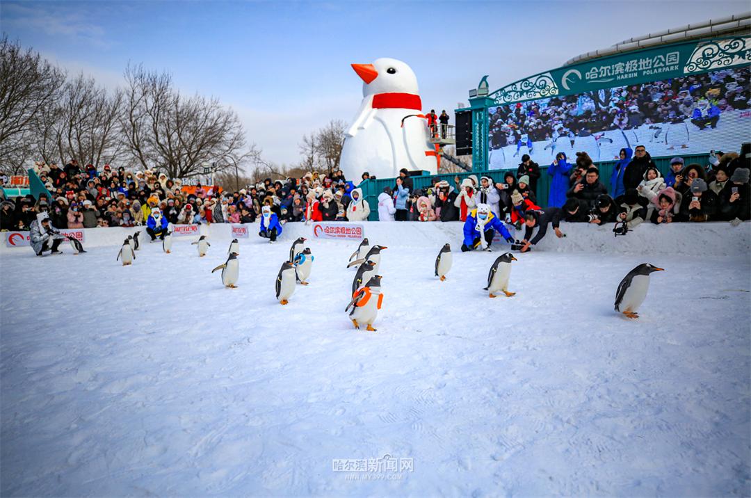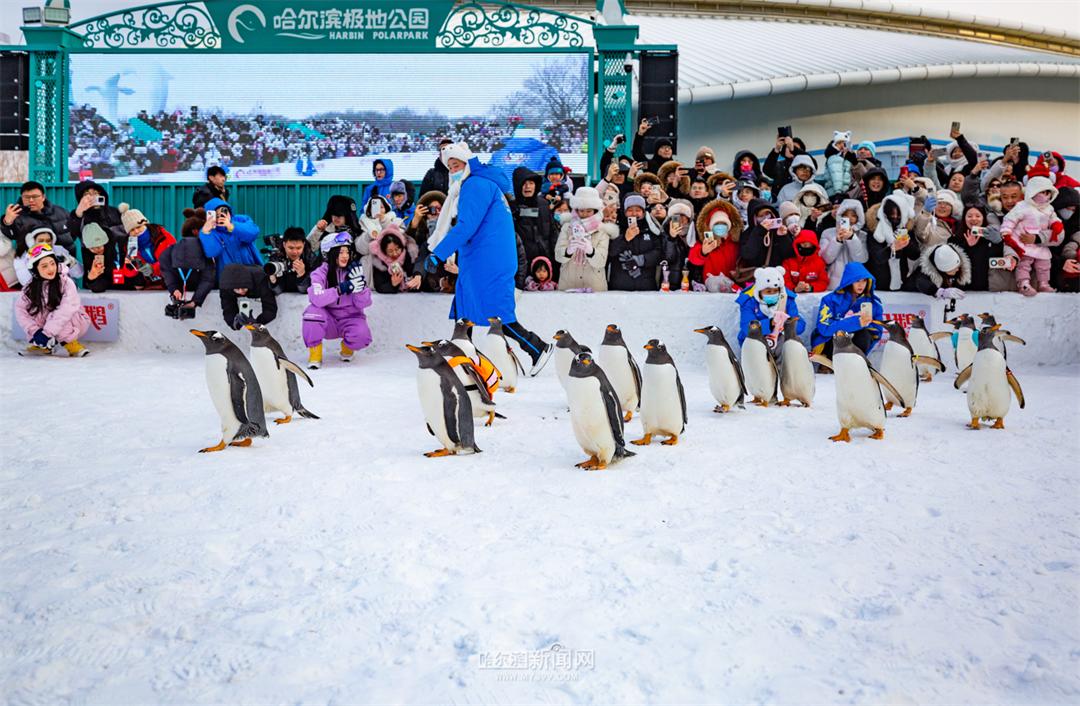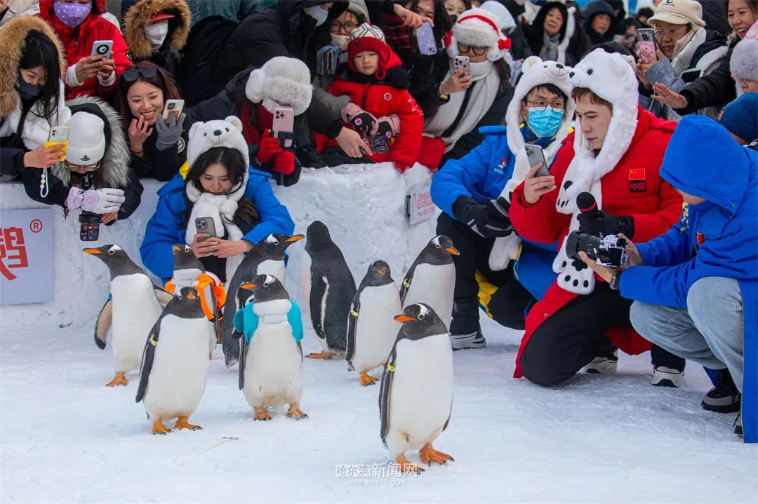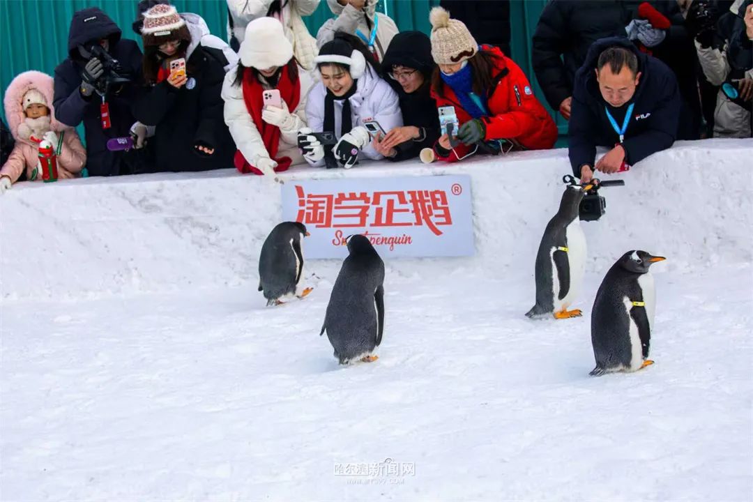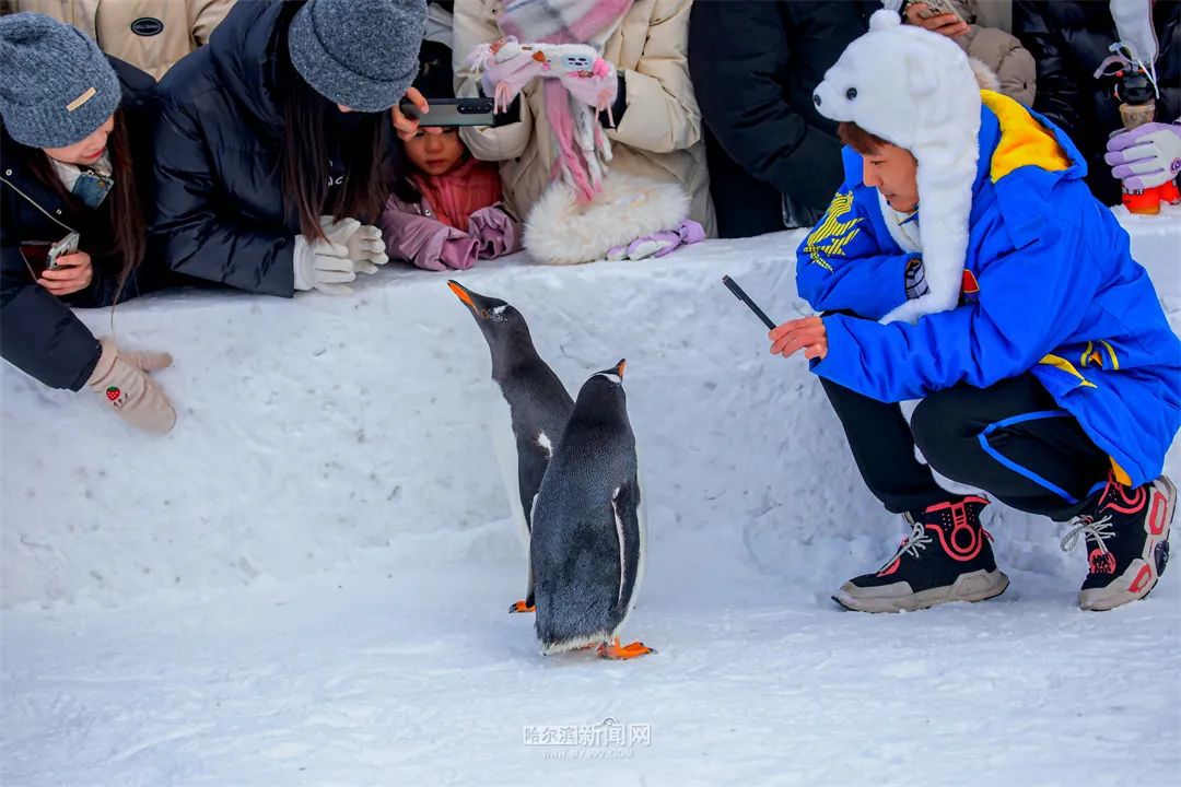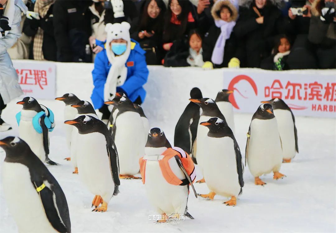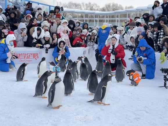 游客大喊“看不够!”哈尔滨极地公园第一场“淘学企鹅”冰雪巡游开启。