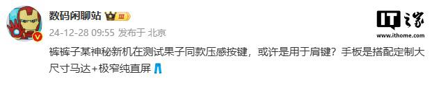 IT 世家 12 月 28 每日新闻,博主 @数码闲聊站 今天爆料说,iQOO 神秘新机测试苹果的同一个压感按钮,可能用于肩键(怀疑),手板是定制大尺寸电机的组合。 极窄纯直屏。